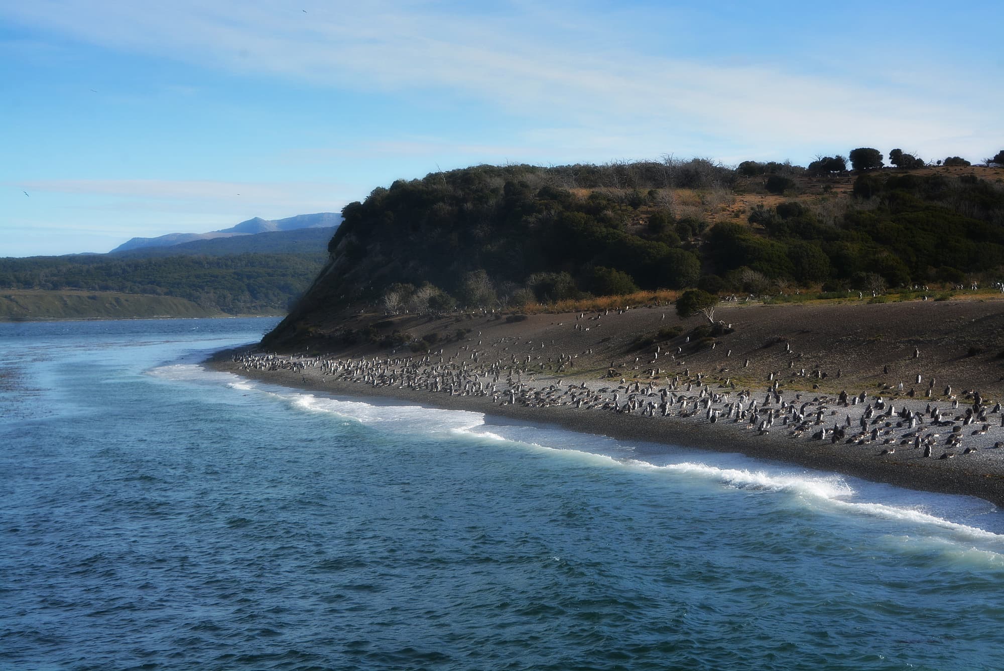 Upon arrival at Martillo Island, we approach the coast to observe the Magellanic penguin colony, and occasionally Gentoo penguins, as they move freely along the beach and swim playfully around the catamaran. Their curiosity and natural behavior make this moment one of the highlights of the trip.